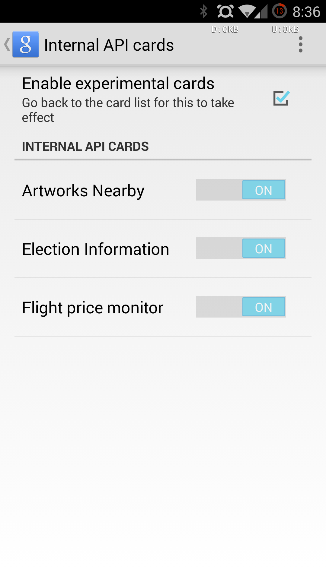 La procedura è molto semplice: dopo aver ottenuto i permessi di root del device, è sufficiente installare il piccolo .apk (trovate i link a fine articolo) e riavviare l’applicazione Google. Avviato Google Now, nelle impostazioni è reperibile la voce “Internal API cards” da cui abilitare la visualizzazione delle card sperimentali.