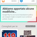Come potete notare dall’immagine mostrata in fondo all’articolo, avviando il Play Store di Google verrà visualizzata una pagina che ci avvisa delle novità introdotte sullo store e due applicazioni consigliate (in questo caso un’app e un brano musicale).