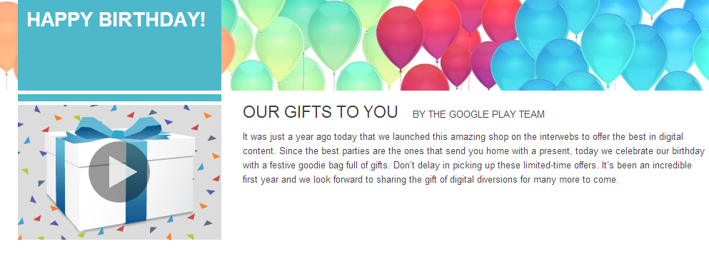 Il Play Store oggi festeggia il suo primo anno di vita, ricco di successo, crescita e download. Google per questa grande occasione ha deciso di far partire una grande settimana piena di promozioni ed app gratuite che potrete trovare su Play Store. Dall’Android Market al Play Store sono cambiate moltissime cose e tutte in un solo anno, a partire dalle novità dei device Nexus ai servizi Books, Music, Magazines (disponibile in USA) e molto altro. Purtroppo ancora in Italia non è arrivato il compleanno del Play Store ma potrete comunque trovare le offerte tramite il sito USA.