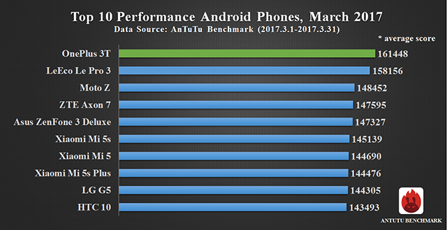 Il podio è occupato da OnePlus 3T, LeEco Le Pro 3 e Moto Z, con relativi punteggi di 161.448, 158.156 ed 148.452.
