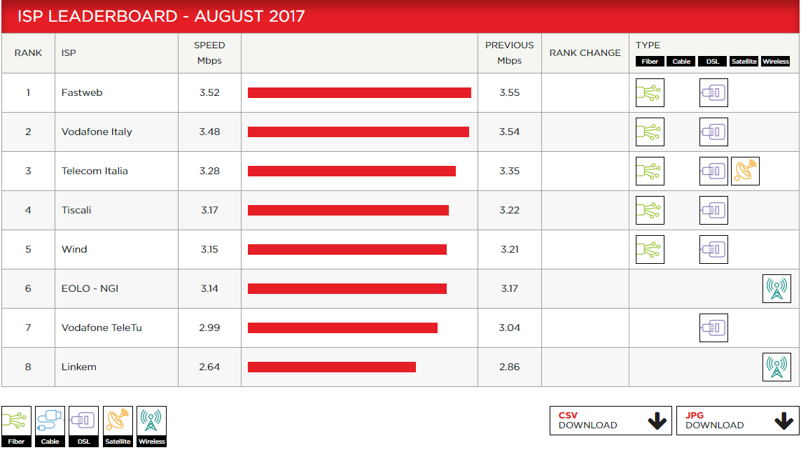 Al vertice della top 8 abbiamo Fastweb, con una velocità di 3.52 Mbps. A seguire, troviamo Vodafone Italy e Telecom Italia, con 3.48 Mbps e 3.28 Mbps. Wind è al quinto posto con 3.15 Mbps, preceduto da Tiscali a quota 3.17 Mbps.