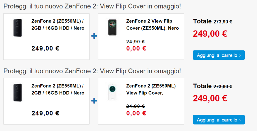 Acquistando un Asus Zenfone 2 ZE550ML dal sito ufficiale Asus entro il 5 Luglio al prezzo di 249 Euro è infatti possibile ricevere in omaggio una flip cover, in colorazione bianca o nera. La cover è normalmente venduta al prezzo di 24.90 Euro.