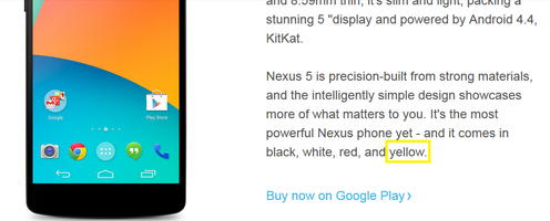 La fondata speculazione deriva da un’immagine catturata da un utente molto attento ai dettagli mentre navigava sul Google Play Store Devices statunitense: come potete notare nella scritta, infatti, è scritto chiaramente che lo smartphone è disponibile in bianco, nero, rosso e giallo, nonostante di quest’ultimo colore non sia ancora in vendita. Non ci stupiremmo se Google volesse dare un tocco d’estate alla sua ultima fatica, giudicata da molti uno dei migliori smartphone del 2013, ed attendiamo ulteriori notizie per tenervi aggiornati.
