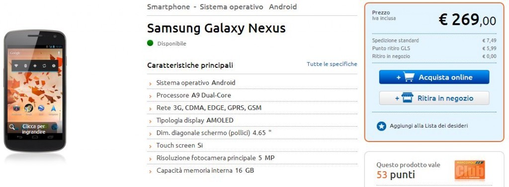 Il Samsung Galaxy Nexus è ancora una volta oggetto di un’interessante promozione: la nota catena di elettronica Marco Polo Expert offre infatti sul suo sito il glorioso googlefonino a 269€.