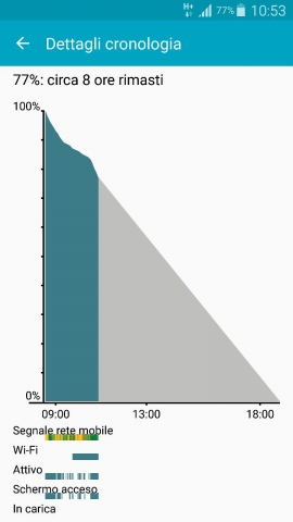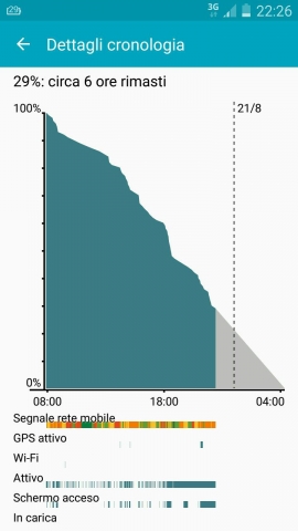 Queste le statistiche di oggi. Finalmente soddisfatto della durata. Solo mi rode che anche oggi qualche app mi ha tenuto acceso il telefono. Penso sia outlook perché più o meno a quell'ora ho configurato la posta. Adesso la tengo monitorata... Sembra un maledetto campo minato. Non ha un po' troppi bug questo Android?