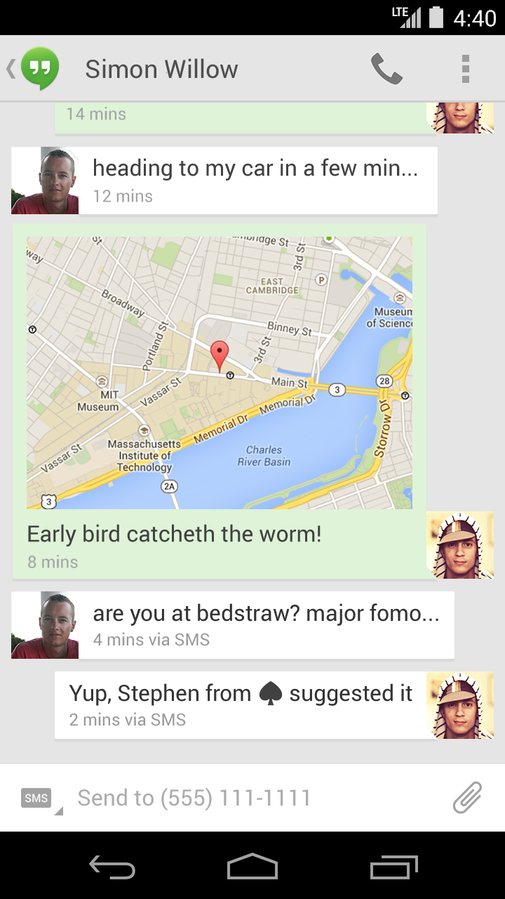 - Conversazioni unite: i tuoi messaggi di Hangout e gli SMS appariranno ora nella stessa conversazione. Quando mandi un messaggio potrai scegliere se mandarlo con Hangout o come SMS. È possibile comunque unire e dividere i due tipi di messaggi.