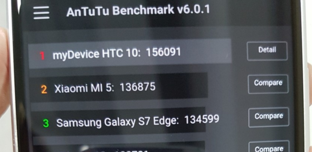 L’immagine che vedete di seguito, proveniente da un anomimo insider di Taiwan e scattata a quanto pare con un Galaxy S7, mostrerebbe infatti il prossimo HTC 10 con la pagina dei risultati di AnTuTu in bella mostra: come vediamo, il punteggio del device, pari a 156091, è ben superiore a quello della concorrenza, con Xiaomi Mi5 e S7 edge che seguono a debita distanza.