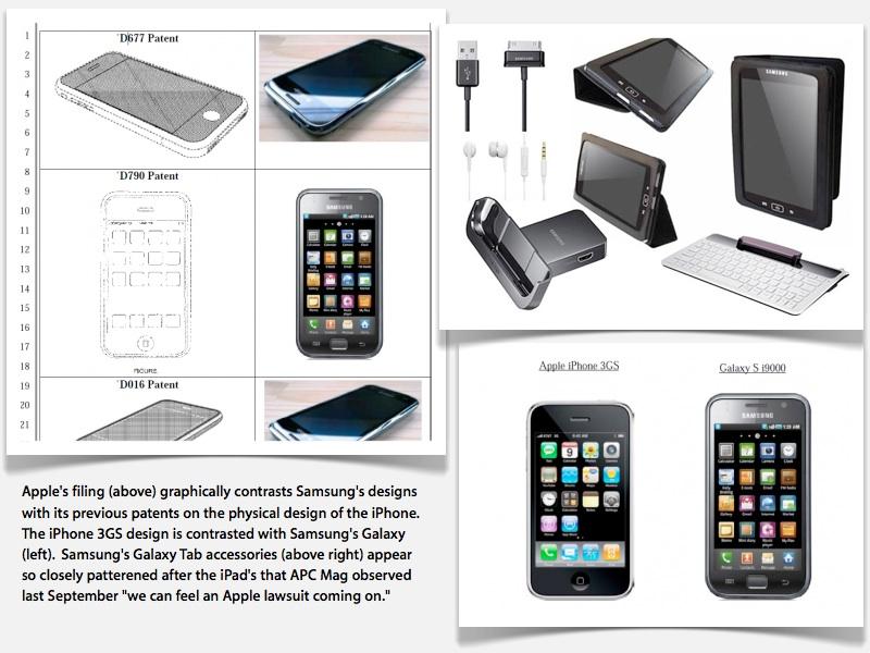 “La copia è così pervasiva che i prodotti Samsung Galaxy sembrano prodotti Apple. Hanno la stessa forma rettangolare con gli angoli arrotondati, bordi argentati, un superficie frontale piana con evidenti bordi neri in alto e in basso, una parte posteriore curvata e uno schermo con icone colorate quadrate con angoli smussati”.