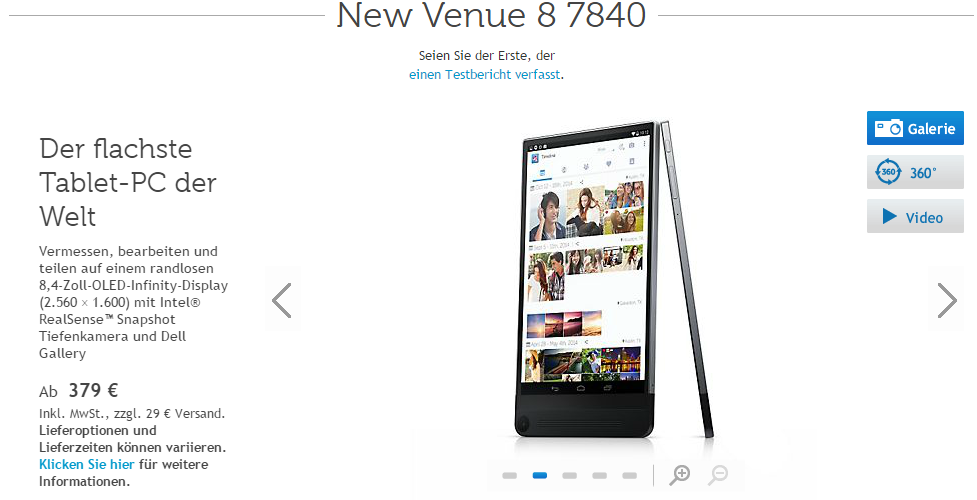 Il nuovo Venue 8 7840, l’ultimo tablet Android di Dell, è arrivato ufficialmente in Europa ad un prezzo di 379€. Attualmente sembra essere disponibile solamente in Germania tramite lo store online del produttore, con spedizioni a partire dal 19 Febbraio ed un costo complessivo che si aggira intorno ai 400€ a causa dei 29€ di costo di spedizione.