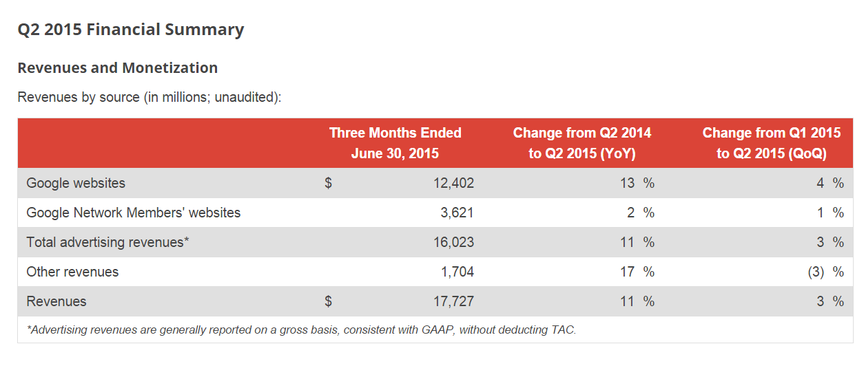 Nel Q2 2015 Google ha infatti incassato ben 17.7 miliardi di Dollari, una crescita dell’11% rispetto allo stesso periodo del 2014. La cifra avrebbe potuto essere addirittura più alta: a causa delle variazioni dei tassi di cambio delle valute estere, Google dichiara infatti di aver “lasciato per strada” ben 1.1 miliardi di Dollari. In crescita sono anche gli utili, pari questo trimestre a 3.93 miliardi (3.3 nel Q2 2014).