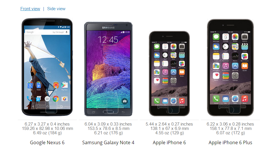 Nexus 6 è stato infatti messo virtualmente a confronto con molti dei suoi concorrenti da PhoneArena: come potete vedere dalle immagini seguenti, le dimensioni sono certamente importanti e superiori a quelle di gran parte dei device inclusi nella comparativa.