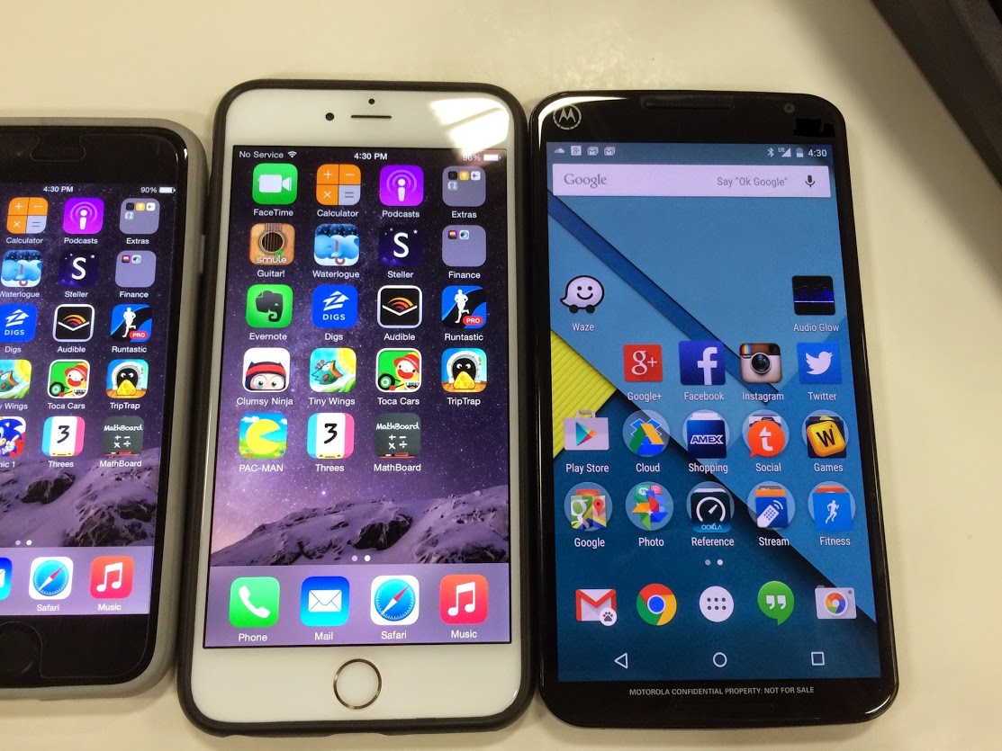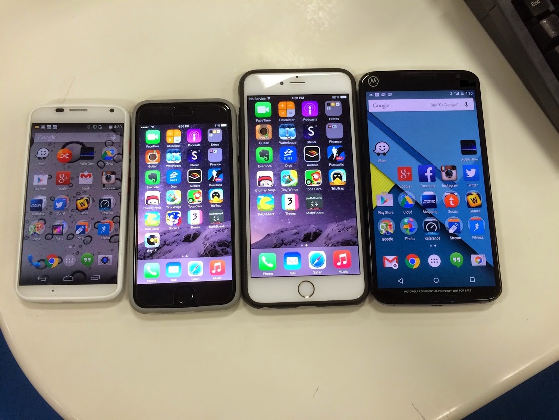 Se non bastasse, tuttavia, il nostro amico Duan Dao, già protagonista della notizia precedente, ci viene incontro fornendoci un foto-confronto reale tra, da destra a sinistra Nexus 6, iPhone 6 Plus, iPhone 6 e Motorola Moto X 2013.