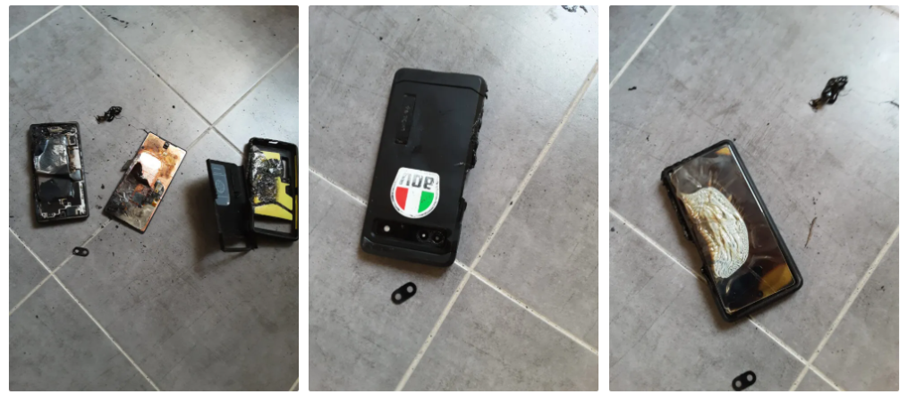 Le foto pubblicate mostrano danni gravi: schermo completamente fuso, scocca bruciata e componenti interni carbonizzati.