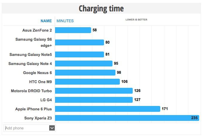 Risultato simile anche per il Samsung Galaxy S6 Edge+, il quale si è spento dopo 9 ore e 29 minuti. Anche i tempi di ricarica sono migliorati, infatti il Note 5 completa la carica in 81 minuti (contro i 94 minuti del Note 4), invece l’S6 Edge+ ne impiega 80 minuti.