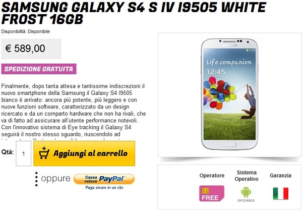 Il Samsung Galaxy S4 è stato lanciato da poco nel nostro paese, ma già è possibile acquistarlo ad un prezzo relativamente basso: solamente 589€ e con garanzia Italia!.