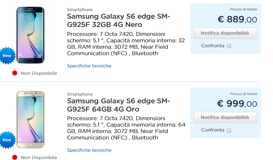 Questa mattina sono stati avvistati sul portale della catena di elettronica Unieuro i prezzi italiani dei nuovi Galaxy S6: come abbiamo riportato, si parte da 739 Euro per la versione flat, mentre nelle ultime ore sono apparsi anche i primi prezzi della versione Edge.