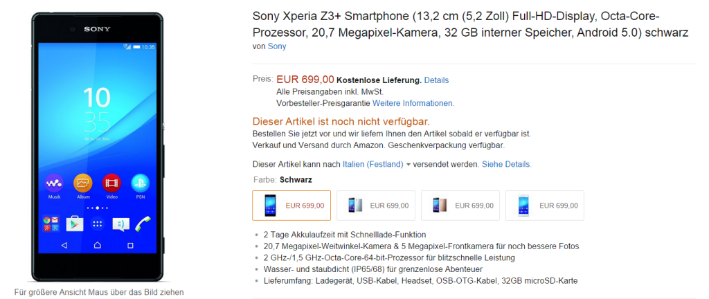 Anche se manca al momento l’ufficialità da parte dello store online Sony, il prezzo europeo di Xperia Z3+ dovrebbe essere di 699 Euro: diversi rivenditori, tra cui Amazon.de o i belgi di SmartphoneShop propongono in preordine il device a tale cifra, mentre nel Regno Unito si parla addirittura di 550 Sterline, pari a circa 750 Euro (Amazon UK, Clove e altri).