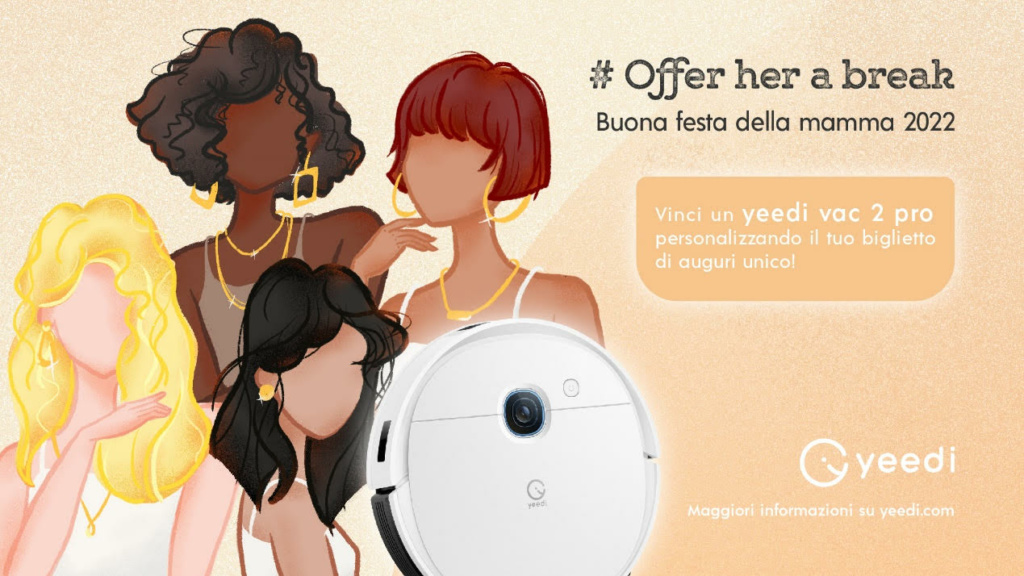 Inoltre, yeedi ha lanciato un giveaway su Instagram e TikTok: condividendo nelle vostre storie la vostra carta regalo personalizzata (creabile a questo indirizzo) accompagnata dagli hashtag #yeedi e #offerherabreak, potrete essere selezionati per ricevere yeedi vac 2 pro in regalo; altri due utenti avranno la possibilità di acquistare ilprodotto con uno sconto del 50%, mentre ad altri tre verrà offerto un voucher di 100€.