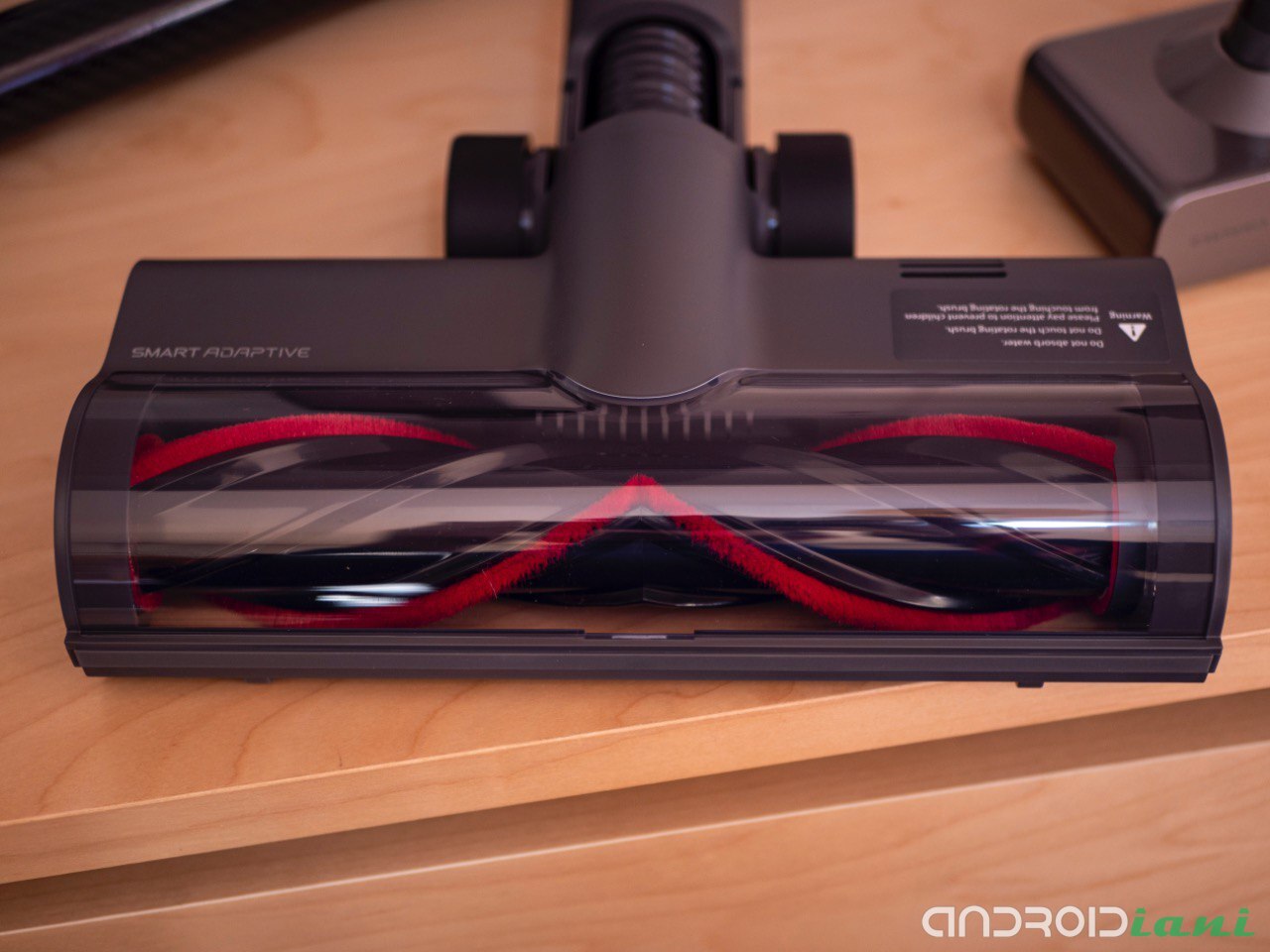 Nella parte inferiore troviamo invece l’ampia batteria, che funge anche da contrappeso, rendendo l’aspirapolvere molto bilanciato e comodo da usare.