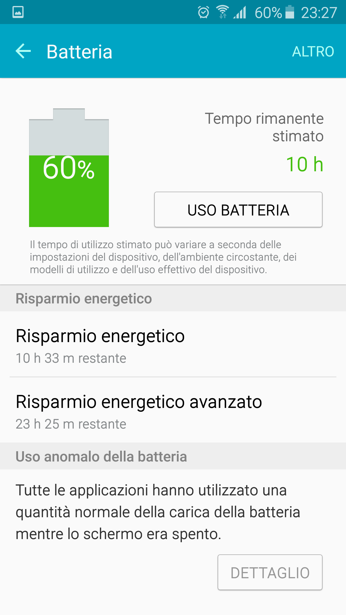 - Risparmio energetico standard: limita le prestazioni massime della CPU, riduce la luminosità dello schermo e la frequenza di fotogrammi, disattiva l’illuminazione dei tasti, disabilità il feedback di vibrazione se attivo e riduce l’intervallo di time-out dello schermo dopo la ricezione delle notifiche