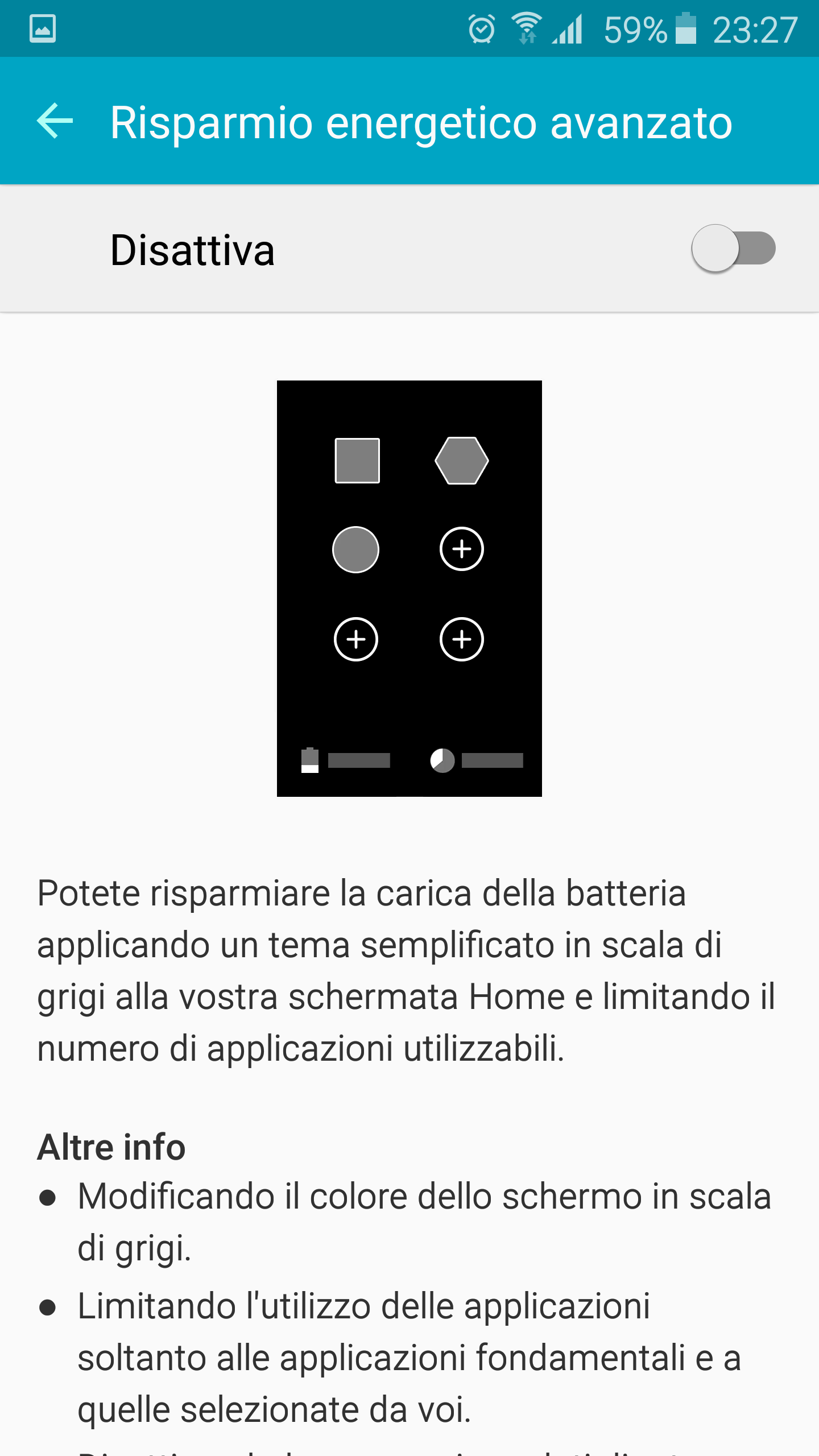 - Risparmio energetico avanzato: applica un tema semplificato in scala di grigi al posto della schermata Home standard limitando il numero delle applicazioni disponibili. Disattiva inoltre la connessione dati e bluetooth quando lo schermo è spento.